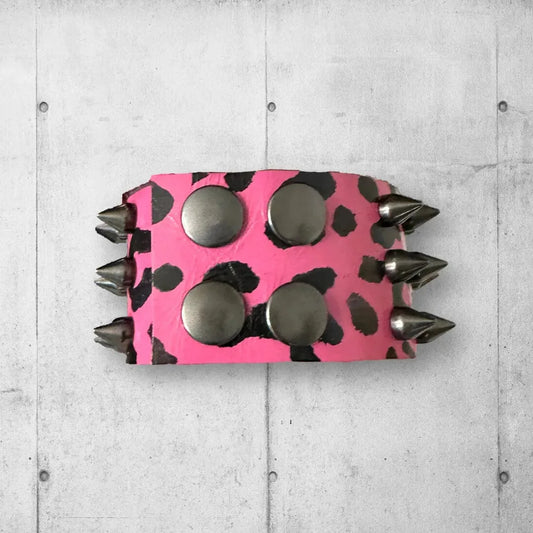 Unisex Pink Leopard Print Spiked Leather Cuff